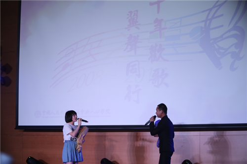 接下来,庆典的特别嘉宾、第一届“歌之翼”冠军、2001级本科毕丹校友闪亮登场,。毕丹专程从成都赶到北京参加庆典。他说:“十年时间,我从一名社会与人口学院的学生成长为一个丈夫、一位父亲,我的身上深深烙下了“社人”二字,无论我在哪里,我心永系社人,只要社人需要我,我一定在!”