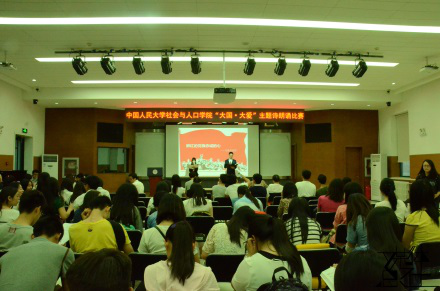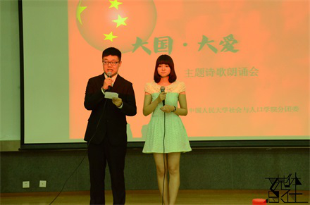 2015年5月22日,由社会与人口学院分团委组织、分团委素质拓展部承办的“大国·大爱”主题诗歌朗诵会在学生活动中心报告厅举行。本次比赛邀请到了社会与人口学院党委副书记唐颖老师作为嘉宾,并由社会与人口学院团学事务助理先虹锦、杨乔乔,农业与农村发展学院团委副书记赵云作为评委。来自社会与人口学院各个年级的10组选手一齐为现场观众呈现了一场视听盛宴。
