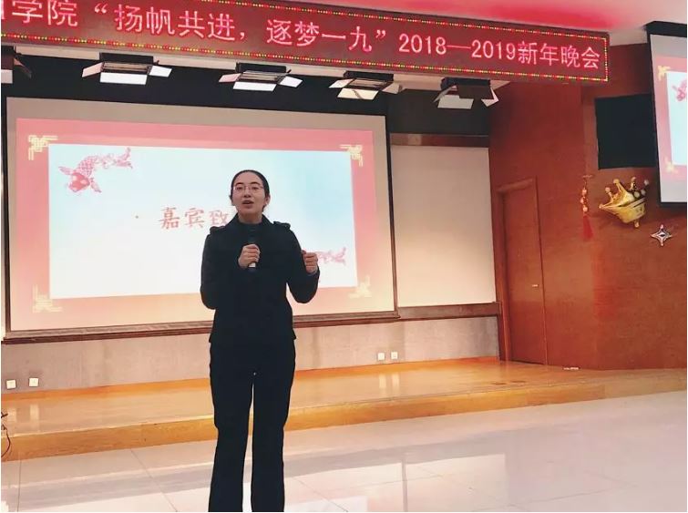 活动之初,唐颖老师致辞。她首先回顾了2018年学院取得的各项成绩,表达了对老师和同学这一年来付出与收获的感谢和祝贺,祝愿大家新年新气象,在这场火热的晚会中开启新的征程。
